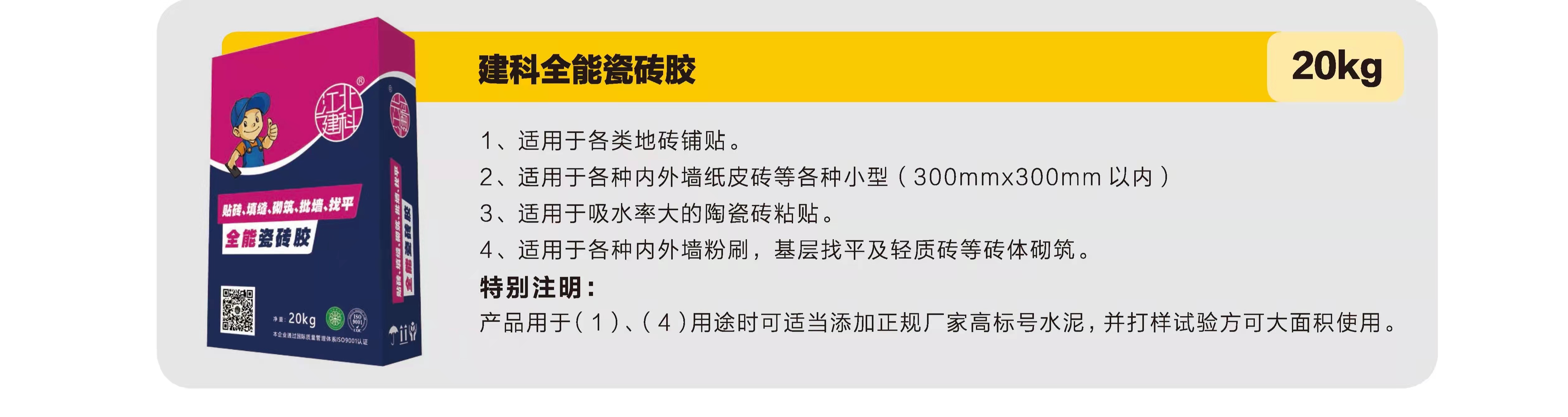 江北建科倡導(dǎo)環(huán)保至上的原則,特推出代替裝修現(xiàn)場(chǎng)用水泥、沙子來(lái)攤鋪貼磚、填縫、砌筑、 批墻、找平的全能砂 漿即全能瓷磚膠,降能降耗,一款多用, 經(jīng)松搞定。產(chǎn)品用于貼磚填縫二合一,一般為灰色如需其 它顏色(白色、黑色、 紅色、咖啡色等)則需提前定制。